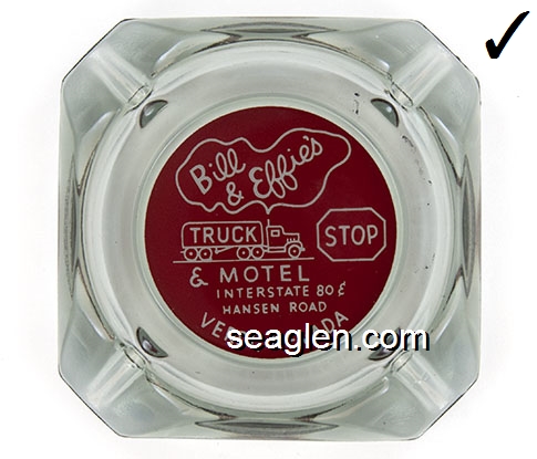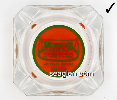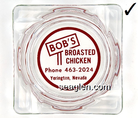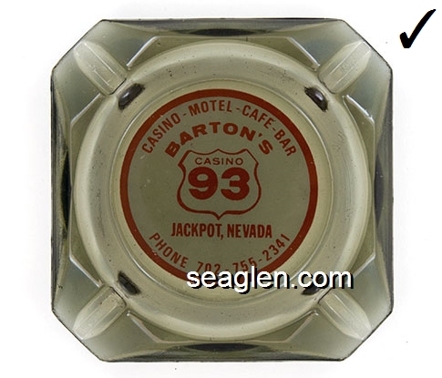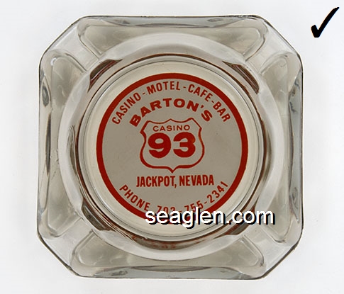 BAC-A1 Barton's Club 93 Casino Jackpot, NV 3 1/2" Smoke Glass Ashtray Red on white imprint: Casino - Motel - Cafe - Bar, Barton's Casino 93, Jackpot, Nevada, Phone 702-755-2341 (Imprint like BAC-23, except square) |