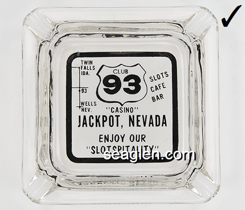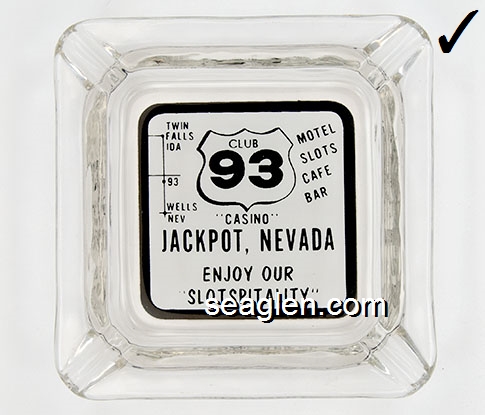 BAC-D1 Barton's Club 93 Casino Jackpot, NV 4" Clear Glass Ashtray Black on white imprint: Club 93 ''Casino'' Jackpot, Nevada, Enjoy Our ''Slotspitality'', Twin Falls Ida, 93, Wells Nev, Motel, Slots, Cafe, Bar |