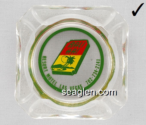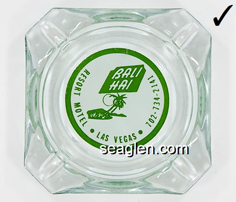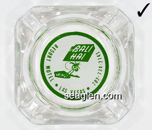 BAH-A1 Bali Hai Motel Las Vegas, NV 3 1/2" Clear Glass Ashtray Green on white imprint: Bali Hai, Resort Motel, Las Vegas, 702-734-2141 (Style A) |