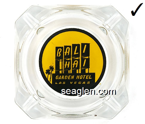 BAH-D1 Bali Hai Motel Las Vegas, NV 3 1/2" Clear Glass Ashtray Black on yellow imprint: Bali Hai, Garden Hotel, Las Vegas |