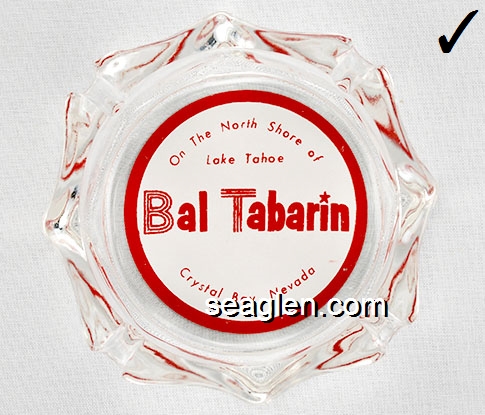 BAL-31 Bal Tabarin Crystal Bay, NV 3 7/8" Clear Glass Ashtray Red on white imprint: On The North Shore of Lake Tahoe, Bal Tabarin, Crystal Bay, Nevada |
