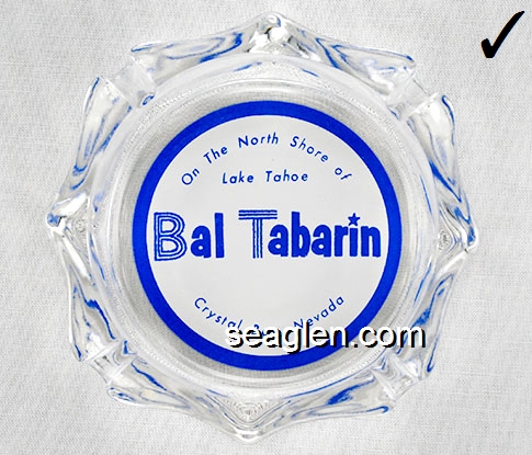 BAL-32 Bal Tabarin Crystal Bay, NV 3 7/8" Clear Glass Ashtray Blue on white imprint: On The North Shore of Lake Tahoe, Bal Tabarin, Crystal Bay, Nevada |