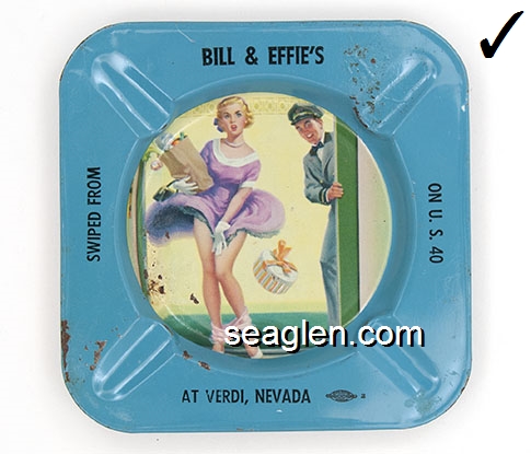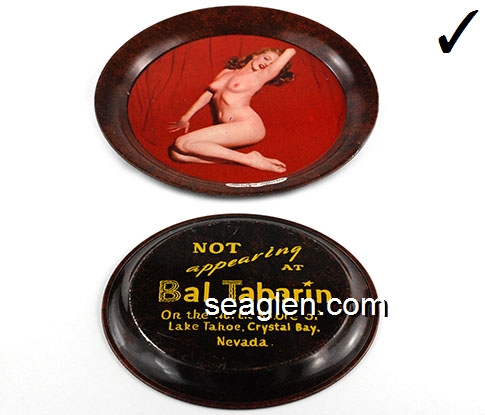 BAL-N1 Bal Tabarin Crystal Bay, NV 4" Brown Metal Ashtray Yellow imprint: Not appearing at Bal Tabarin, On the North Shore of Lake Tahoe, Crystal Bay, Nevada (Top side has nude picture of Marilyn Monroe, bottom side has imprint.) |