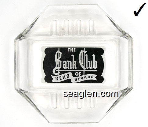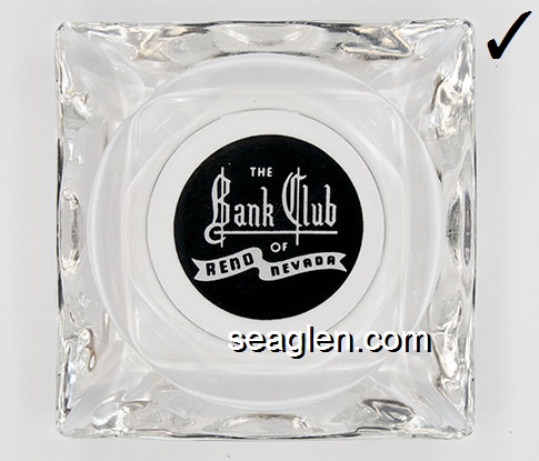 BAN-P1 Bank Club (Reno) Reno, NV 5" Clear Glass Ashtray White on black imprint: The Bank Club of Reno Nevada (SAFEX style) |