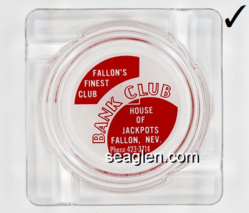 BAN-A1 Bank Club (Fallon) Fallon, NV 4 1/4" Clear Glass Ashtray Red on white imprint: Fallon's Finest Club, Bank Club, House of Jackpots, Fallon, Nev. Phone 423-3714 (Like BAN-12, except Phone No.) |