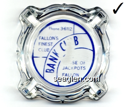 BAN-B1 Bank Club (Fallon) Fallon, NV 3 11/16" Clear Glass Ashtray Blue imprint: Phone 3-6112, Fallon's Finest Club, Bank Club, House of Jackpots, Fallon, Nev. (Like BAN-10, except blue imprint) |