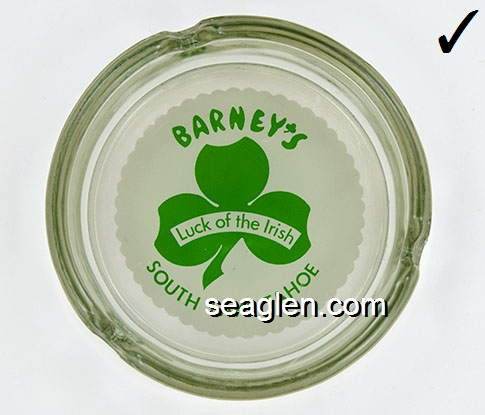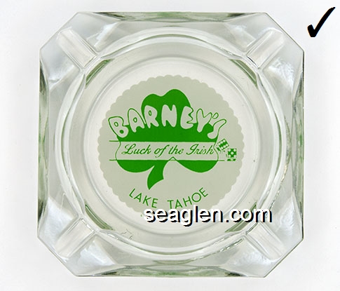 BAR-11 Barney's Casino Lake Tahoe, NV 3 1/2" Clear Glass Ashtray Green on white imprint: Barney's Luck of the Irish, Lake Tahoe |