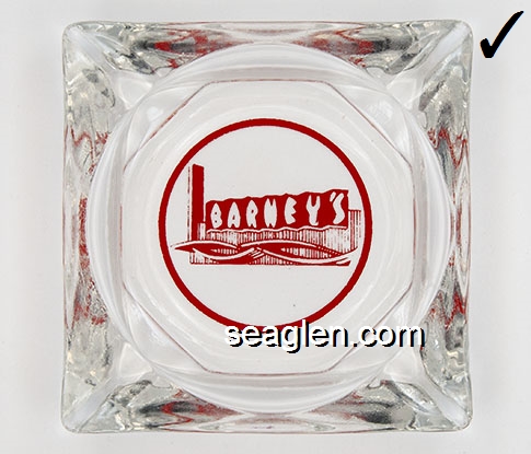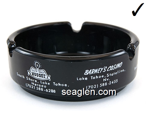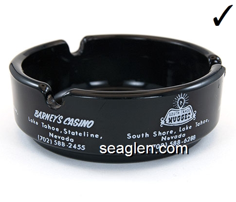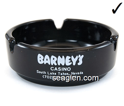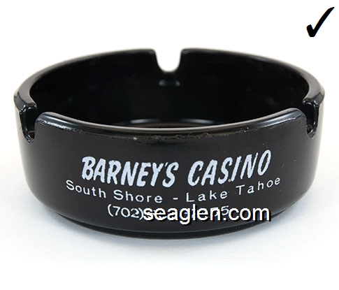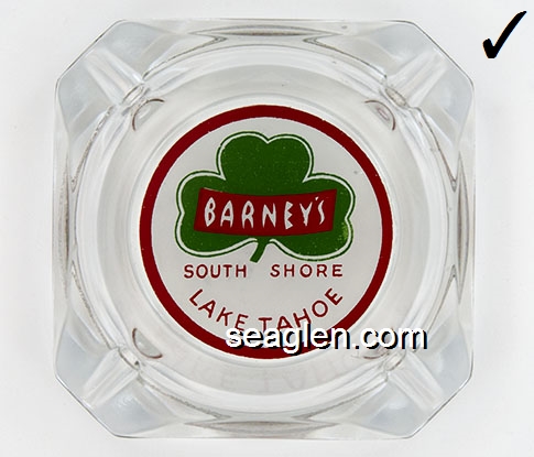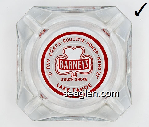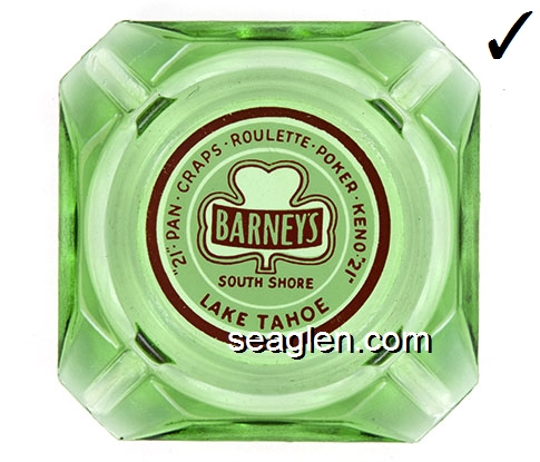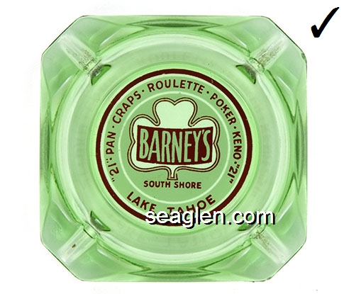 BAR-R1 Barney's Casino Lake Tahoe, NV 3 1/2" Green Glass Ashtray Red on white imprint: ''21'' - Pan - Craps - Roulette - Poker - Keno - ''21'' Barney's South Shore Lake Tahoe (Like BAR-12, except with larger Barney's imprint.) |