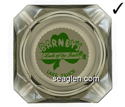 BAR-Q1 Barney's Casino Lake Tahoe, NV 3 1/2" Smoke Glass Ashtray Green on white imprint: Barney's Luck of the Irish, Lake Tahoe (Like BAR-11, except smoke glass) |