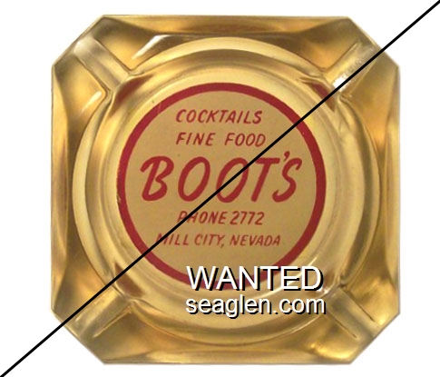 BCB-A1 Boot's Cafe & Bar Mill City, NV 3 1/2" Amber Glass Ashtray Red on white imprint: Cocktails, Fine Food, Boot's, Phone 2772, Mill City, Nevada |