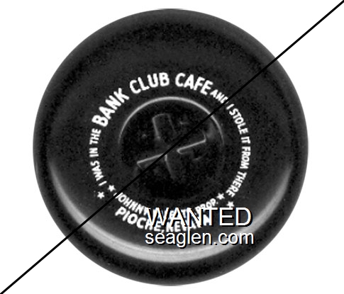 BCP-A1 Bank Club (Pioche) Pioche, NV 3 13/16" Black Plastic Ashtray White imprint: I Was In The Bank Club Cafe And I Stole It From There, Johnny Valente, Prop., Pioche, Nevada |