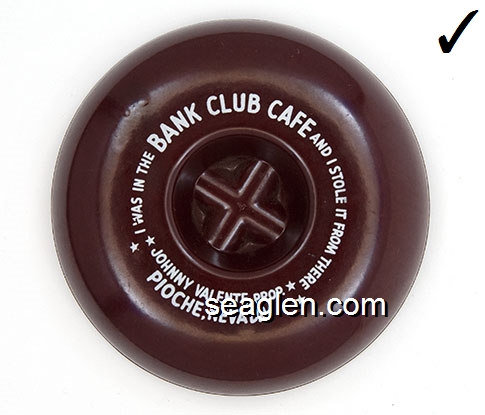 BCP-A2 Bank Club (Pioche) Pioche, NV 3 13/16" Brown Plastic Ashtray White imprint: I Was In The Bank Club Cafe And I Stole It From There, Johnny Valente, Prop., Pioche, Nevada |
