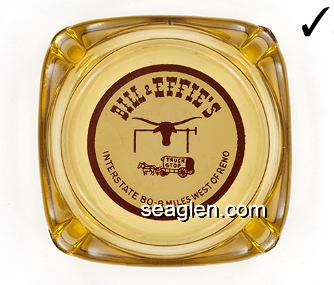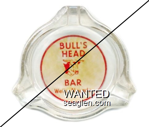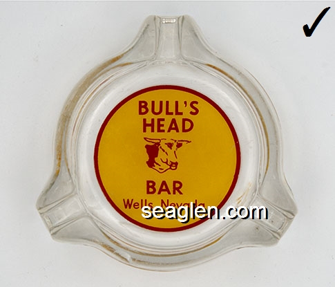 BHB-B1 Bull's Head Bar Wells, NV 3 1/2" Clear Glass Ashtray Red on yellow imprint: Bull's Head Bar, Wells, Nevada |