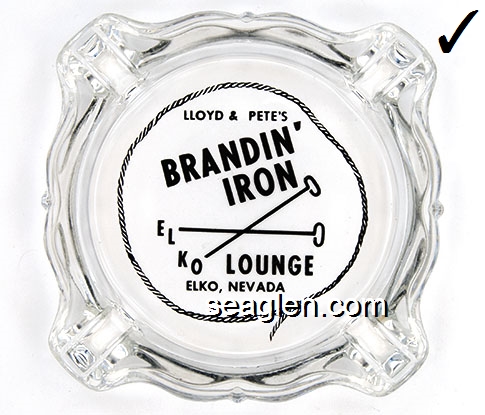 BIE-A1 Branding Iron Lounge Elko, NV 3 11/16" Clear Glass Ashtray Black imprint: Lloyd & Pete's, Brandin' Iron Lounge, Elko, Nevada |
