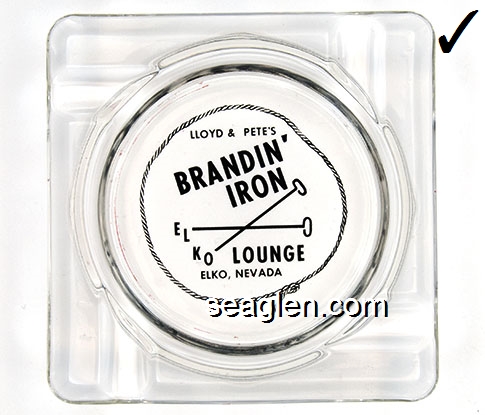 BIE-B1 Branding Iron Lounge Elko, NV 4 1/4" Square Glass Ashtray Black imprint: Lloyd & Pete's, Brandin' Iron Lounge, Elko, Nevada |