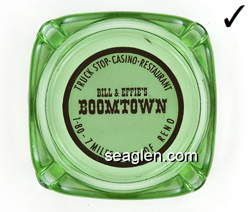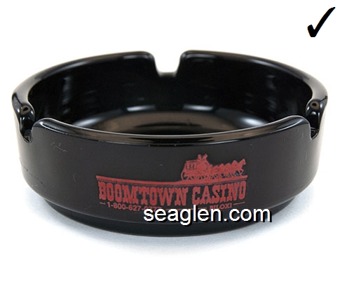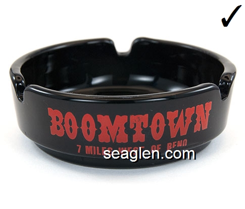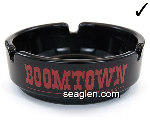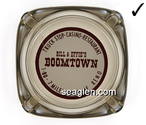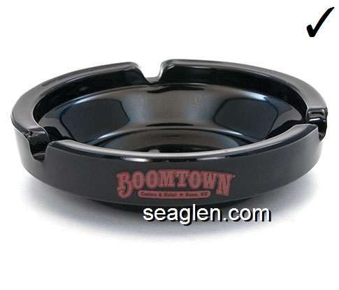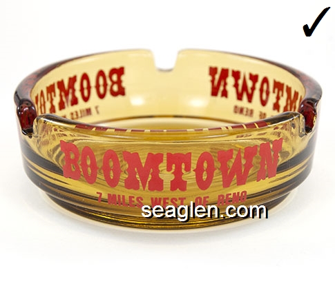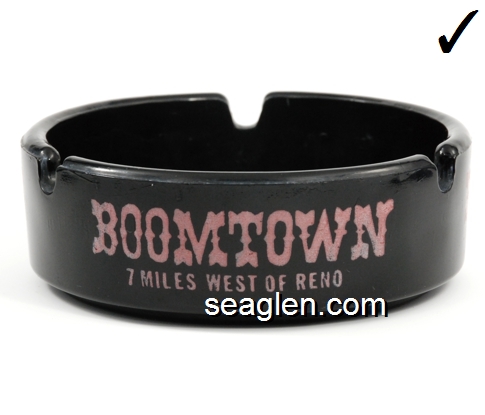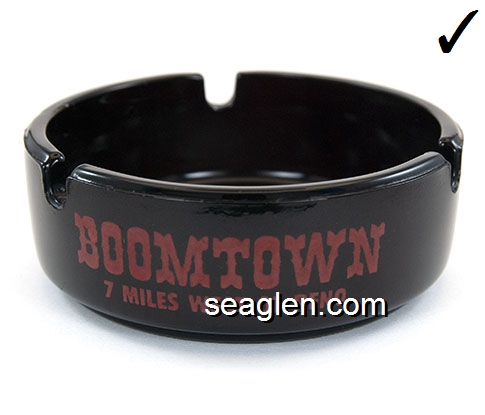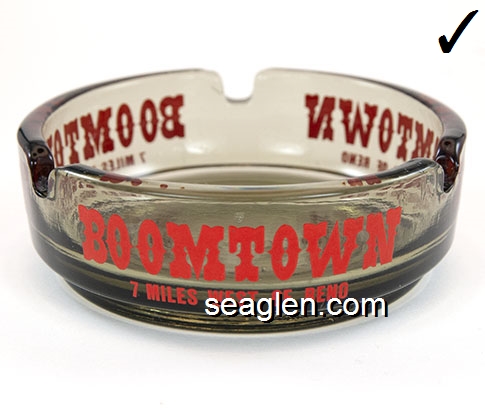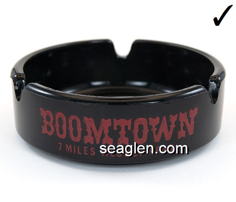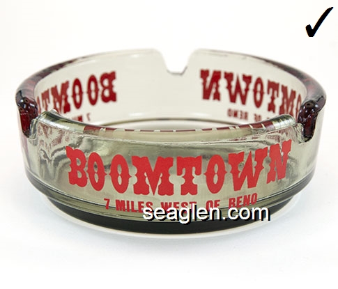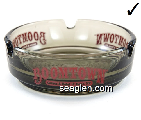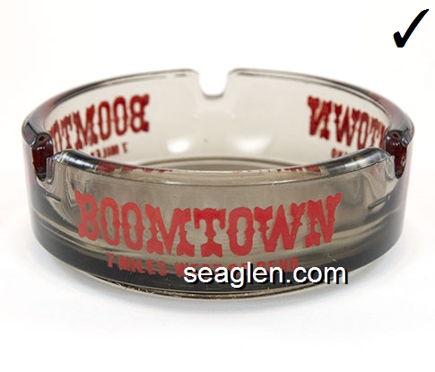 BOT-A3 Boomtown Casino Reno, NV 3 1/2" Smoke Glass Ashtray Red imprint: Boomtown, 7 Miles West of Reno (Like BOT-04, except with smooth bottom) |
