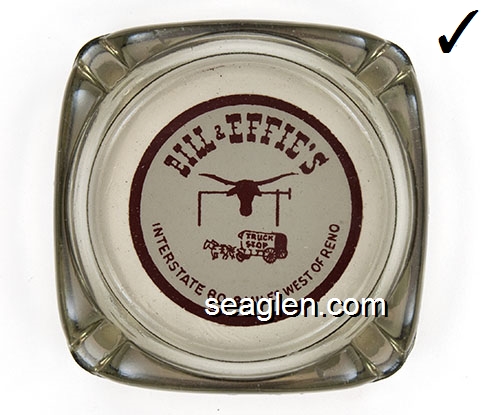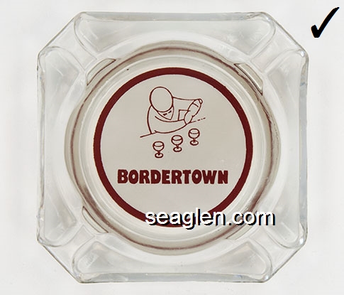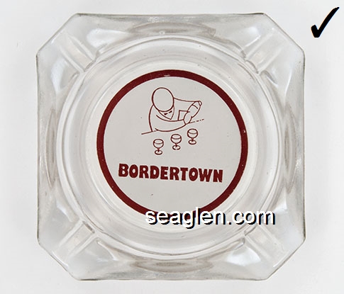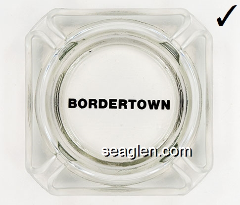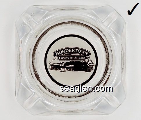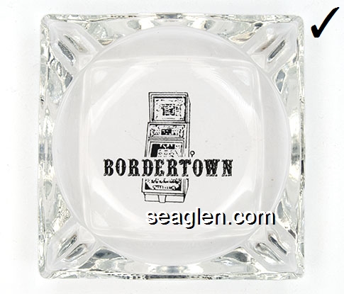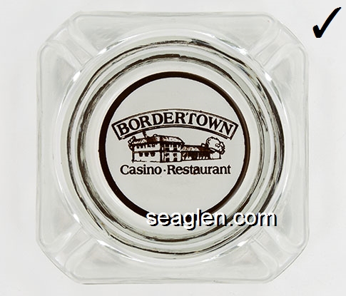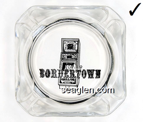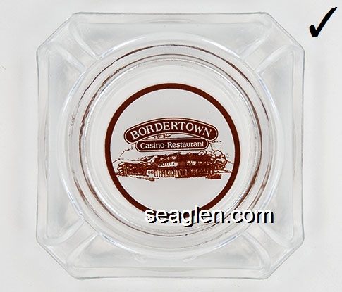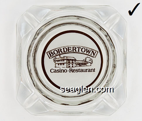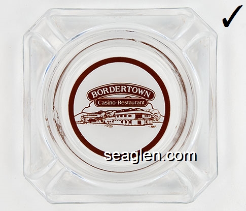BOR-B4 Bordertown Casino Reno, NV 3 5/8" Clear Glass Ashtray Brown on white imprint: Bordertown Casino - Restaurant (Similar to BOR-08, with different artwork. TAIWAN moulded under one corner.) |