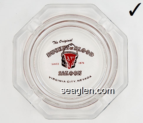 BKT-C1 Bucket of Blood Virginia City, NV 4 5/8" Clear Glass Ashtray Brown and red imprint: The Original Bucket of Blood Saloon, Since 1876, Virginia City, Nevada |