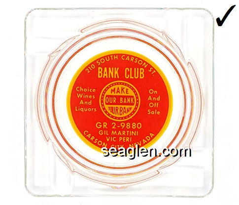 BNC-A1 Bank Club (Carson) Carson City, NV 4 3/16" Clear Glass Ashtray Yellow on red imprint: 210 South Carson St., Bank Club, Make Our Bank Your Bank, Choice ... Off Sale, GR 2-9880, Gil Martini, Vic Peri, Carson City, Nevada |