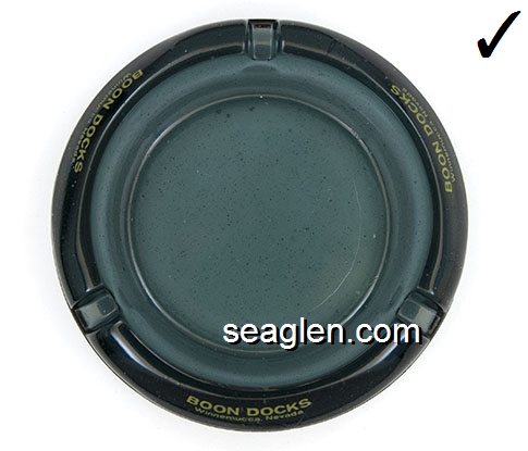 BOC-01 Boon Docks Winnemucca, NV 4 5/16" Smoke Glass Ashtray Yellow imprint: Boon Docks, Winnemucca, Nevada |