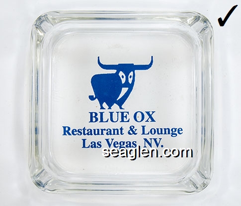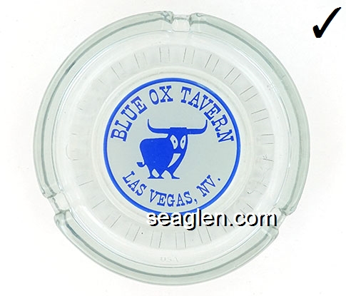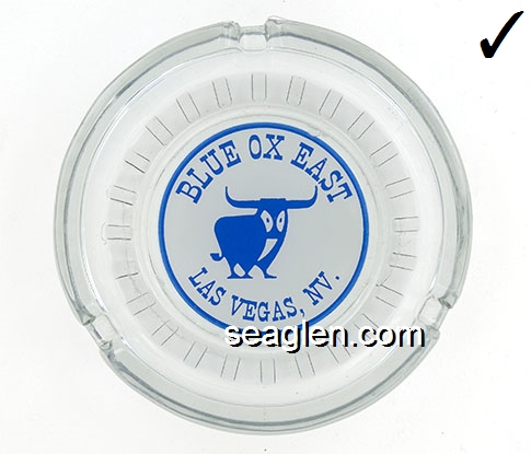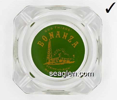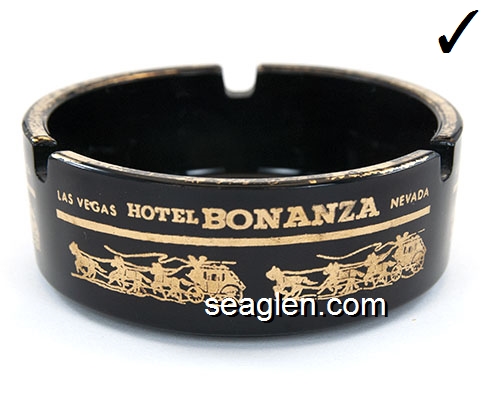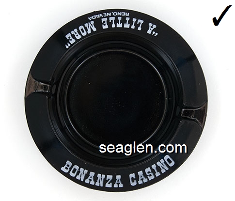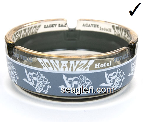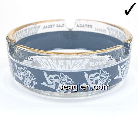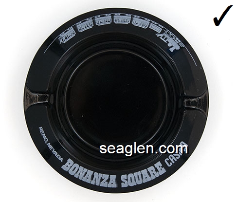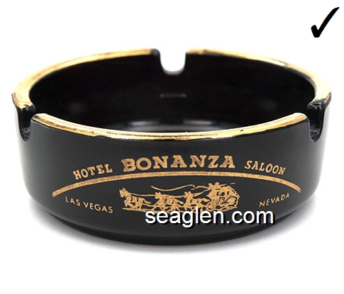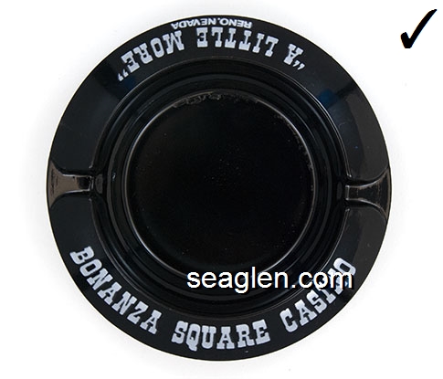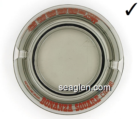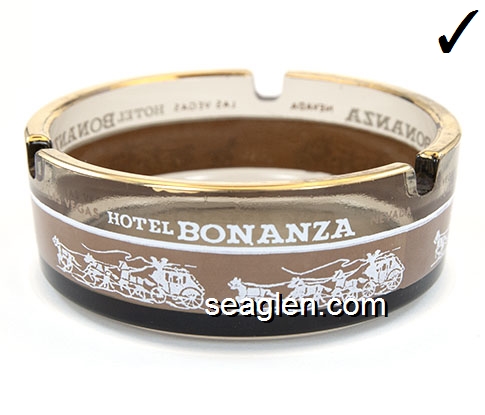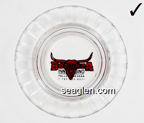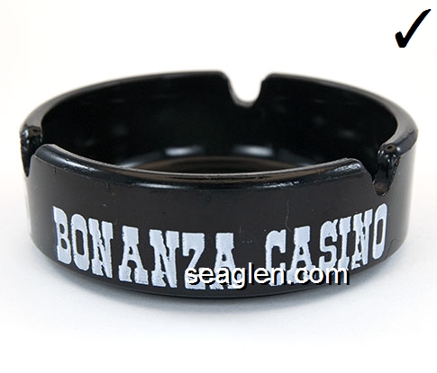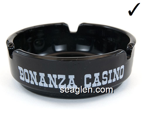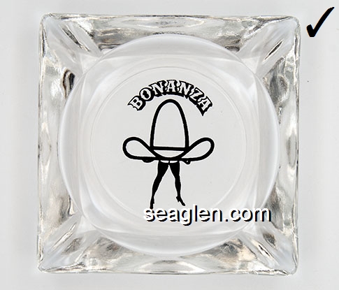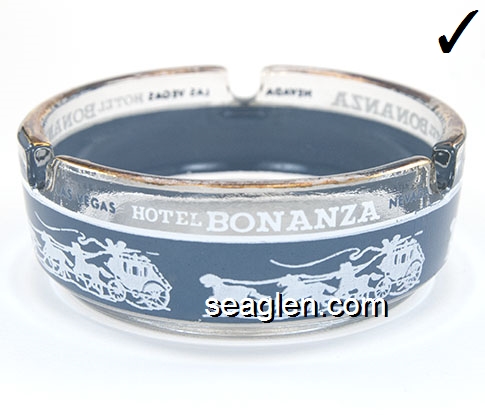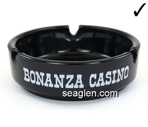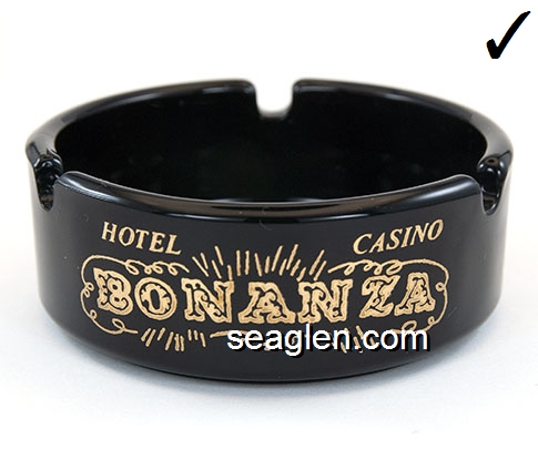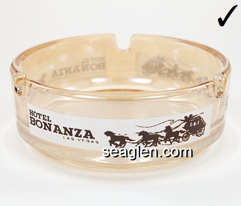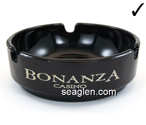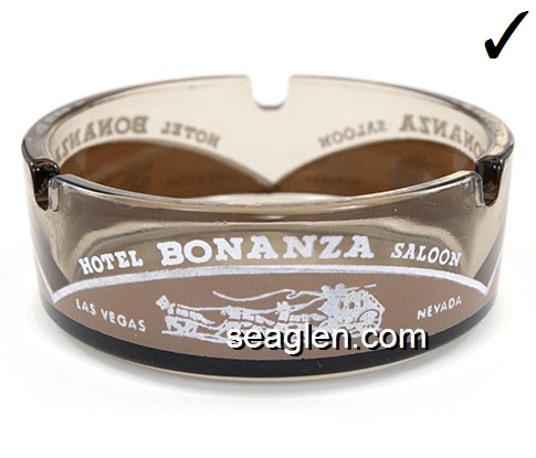 BON-N1 Bonanza Hotel Las Vegas, NV 3 1/2" Smoke Glass Ashtray White and gray imprint: Las Vegas, Bonanza Hotel, Nevada (Like BON-02, except smooth bottom) |