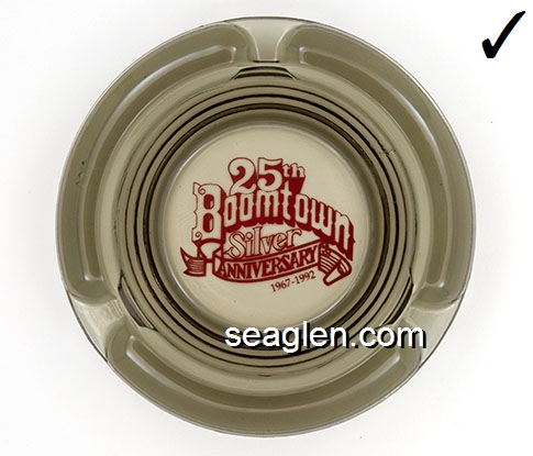 BOT-08 Boomtown Casino Reno, NV 4 1/2" Smoke Glass Ashtray Red imprint: 25th Boomtown, Silver Anniversary, 1967-1992 |