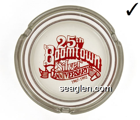 BOT-B1 Boomtown Casino Reno, NV 3 1/2" Clear Glass Ashtray Red imprint: Boomtown, 25th Silver Anniversary, 1967-1992 (Like BOT-08, except 3 1/2'' stacking) |