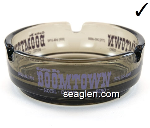BOT-C2 Boomtown Casino Reno, NV 3 9/16" Smoke Glass Ashtray Purple imprint: Gotta Be Boomtown, Hotel - Casino Reno, (800) 648-3790 (775) 345-6000 |