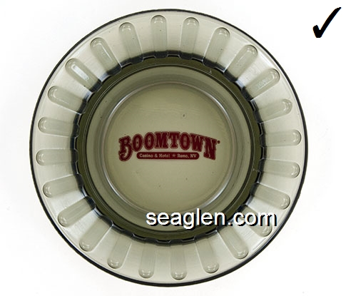 BOT-A4 Boomtown Casino Reno, NV 3 1/2" Smoke Glass Ashtray Red imprint: Boomtown, 7 Miles West of Reno (Like BOT-04, except with 10 rings) |