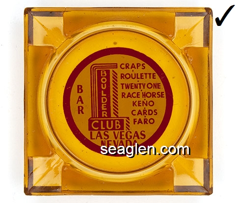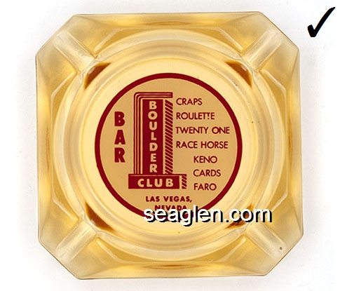 BOU-D1 Boulder Club Las Vegas, NV 3 1/2" Amber Glass Ashtray Red on white imprint: Bar, Craps - Roulette - Twenty One - Race Horse Keno - Cards - Faro, Las Vegas, Nevada |