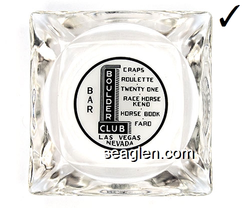 BOU-A2 Boulder Club Las Vegas, NV 3 1/2" Clear Glass Ashtray Black on white imprint: Bar, Craps - Roulette - Twenty One - Race Horse Keno - Horse Book - Faro, Las Vegas Nevada |