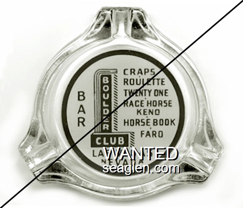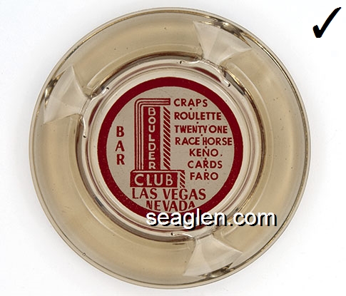 BOU-C2 Boulder Club Las Vegas, NV 4" Smoke Glass Ashtray Red on white imprint: Bar, Craps - Roulette - Twenty One - Race Horse Keno - Cards - Faro, Las Vegas Nevada |
