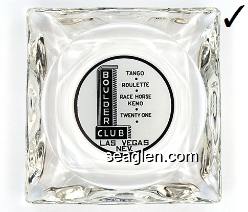 BOU-B1 Boulder Club Las Vegas, NV 3 1/2" Clear Glass Ashtray Black on white imprint: Boulder Club, Tango - Roulette - Race Horse Keno - Twenty One - Las Vegas Nev. |