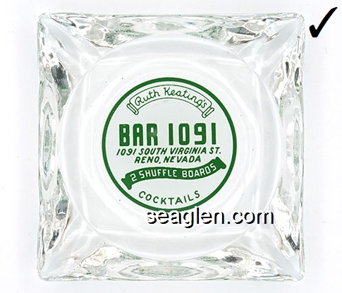 BRK-A1 Bar 1091 Reno, NV 3 1/2" Clear Glass Ashtray Green on white imprint: Ruth Keating's, Bar 1091, 1091 South Virginia St., Reno, Nevada, 2 Shuffle Boards, Cocktails |