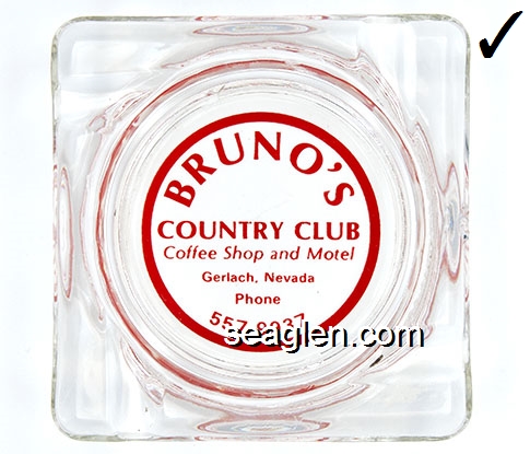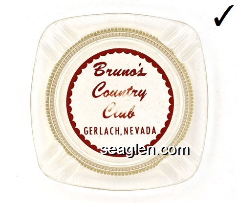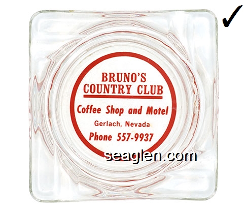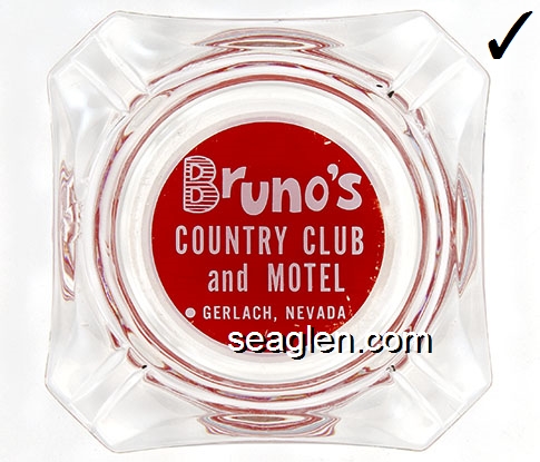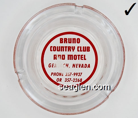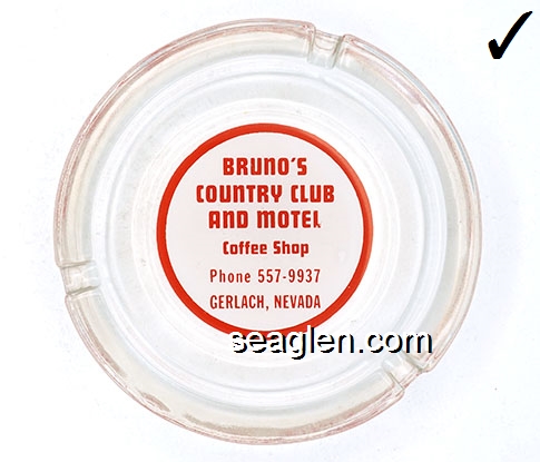 BRU-D1 Bruno's Country Club Gerlach, NV 4 1/4" Clear Glass Ashtray White on red imprint: Bruno's Country Club and Motel - Gerlach, Nevada |