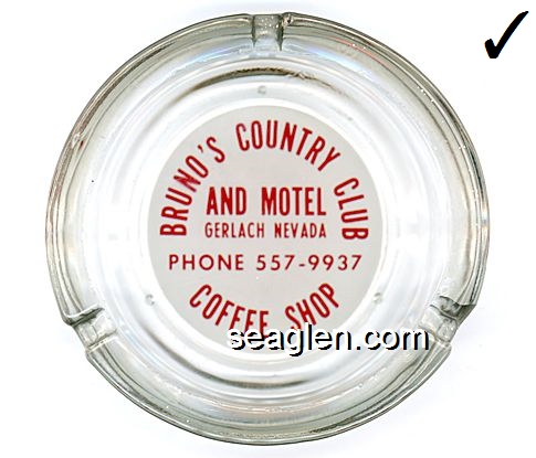 BRU-A1 Bruno's Country Club Gerlach, NV 4 1/2" Clear Glass Ashtray Red on white imprint: Bruno's Country Club and Motel, Coffee Shop, Phone 557-9937, Gerlach, Nevada |