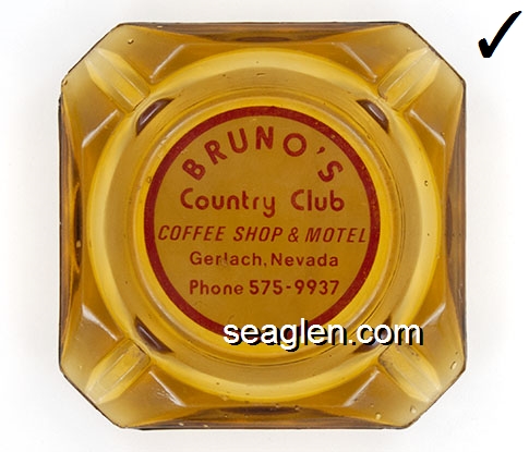 BRU-C1 Bruno's Country Club Gerlach, NV 3 1/2" Amber Glass Ashtray Red on white imprint: Bruno's Country Club, Coffee Shop & Motel, Gerlach, Nevada, Phone 575-9937 |