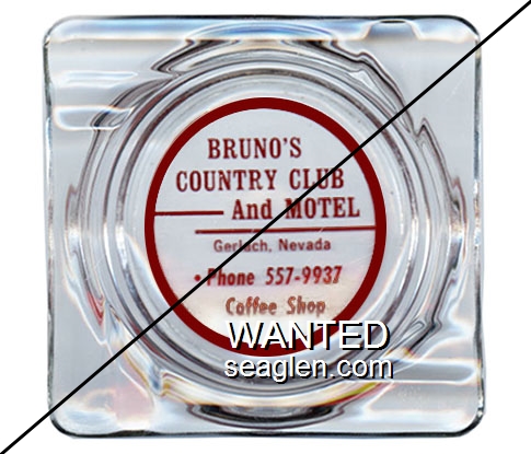 BRU-A3 Bruno's Country Club Gerlach, NV 4 1/2" Clear Glass Ashtray Red imprint: Bruno Country Club and Motel, Gerlach, Nevada, Phone 357-9937 Or 357-2268 |