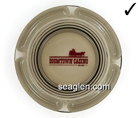 BTB-B1 Boomtown Casino, Biloxi Biloxi, MS 4 1/2" Smoke Glass Ashtray Red imprint: Boomtown Casino, Biloxi |