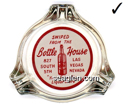 BTL-A1 Bottle House Las Vegas, NV 3 1/4" Clear Glass Ashtray Red on white imprint: Swiped From The Bottle House, 827 South 5th, Las Vegas Nevada, ''Your Friendly Liquor Store'' |