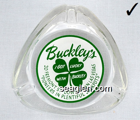 BUC-B1 Buckley's Jackpot Club Las Vegas, NV 3 1/2" Clear Glass Ashtray Green on white imprint: Buckley's, I Got Lucky With Buckley's, 20 Freemont St - Downtown Las Vegas, ''Pioneers in Plentiful Jackpots'' |