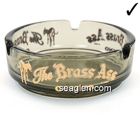 TBA-01 Brass Ass Casino Cripple Creek, CO 3 9/16" Green Smoke Glass Ashtray Gold imprint: The Brass Ass Casino |