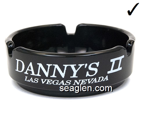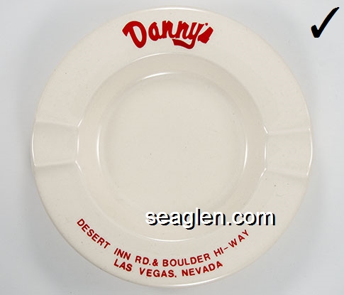 DAN-A2 Danny's Slot Country Las Vegas, NV 5 1/4" White Porcelain Ashtray Red imprint: Danny's, Desert Inn Rd. & Boulder Hi-Way, Las Vegas, Nevada (No notches inside; Rd. vs. Road) |