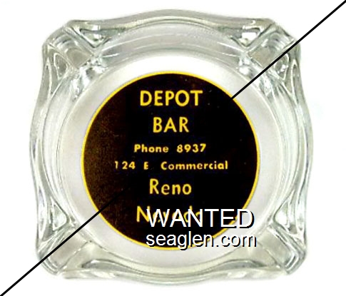 DEP-A2 Depot Club Reno, NV 3 7/16" Clear Glass Ashtray Yellow on black imprint: Opposite S.P. Depot, Depot Bar, 124 E. Commercial, Reno Nevada |