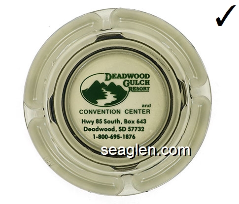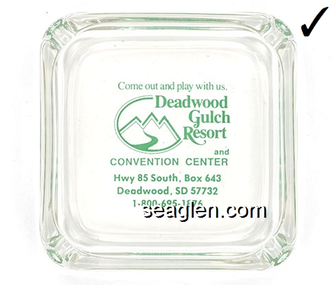 DGR-A1 Deadwood Gulch Resort Deadwood, SD 3 3/4" Clear Glass Ashtray Green imprint: Come out and play with us. Deadwood Gulch Resort and Convention ... Hwy 85 South, Box 643, Deadwood, SD 57732, 1-800-695-1876 |