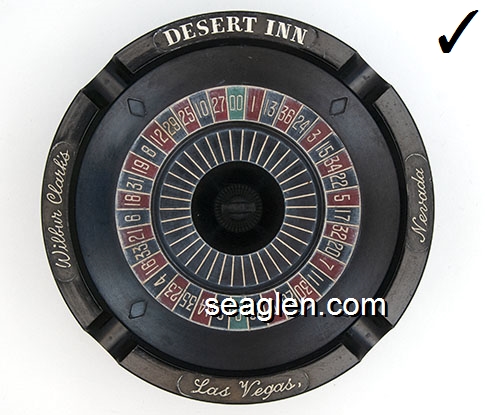 DIC-B1 Desert Inn Las Vegas, NV 5" Black Plastic Ashtray White imprint: Wilbur Clark's Desert Inn, Las Vegas, Nevada (Bottom: Sybab MFG Co., Los Angeles, Cal., Pat. Pend.) |