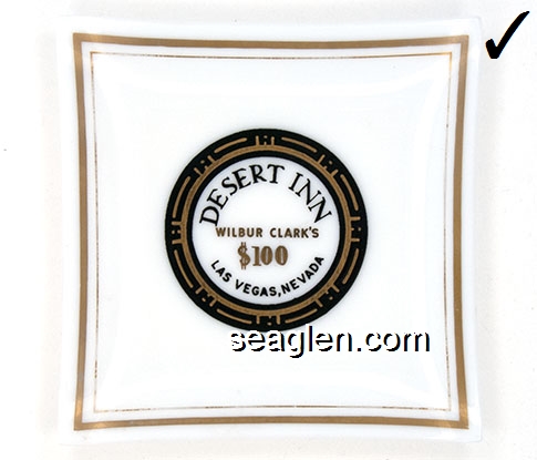 DIC-G1 Desert Inn Las Vegas, NV 3 3/4" White Porcelain Ashtray Black and gold imprint: Desert Inn, Wilbur Clark's, $100, Las Vegas, Nevada |