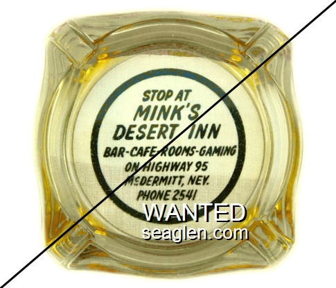 DIM-A1 Desert Inn, McDermitt McDermitt, NV 3 7/16" Yellow Glass Ashtray Black imprint: Stop At Mink's Desert Inn, Bar - Cafe - Rooms - Gaming, On Highway 95, McDermitt, Nev., Phone 2541 |