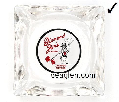 DJJ-A1 Diamond Jims Jackpot, NV 3 1/2" Clear Glass Ashtray Red and black on white imprint: Diamond Jim's Casino, Jackpot Nevada |