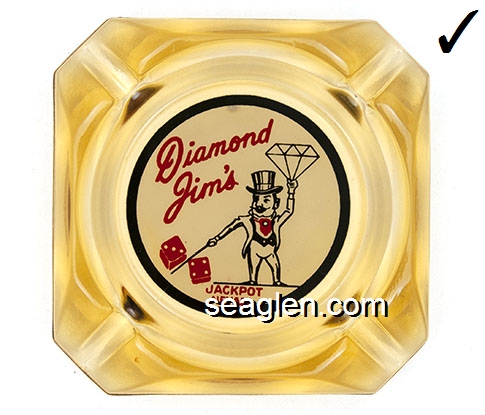 DJJ-C1 Diamond Jims Jackpot, NV 3 1/2" Amber Glass Ashtray Red and black on white imprint: Diamond Jim's Gambling Hall and Saloon, Jackpot Nevada |